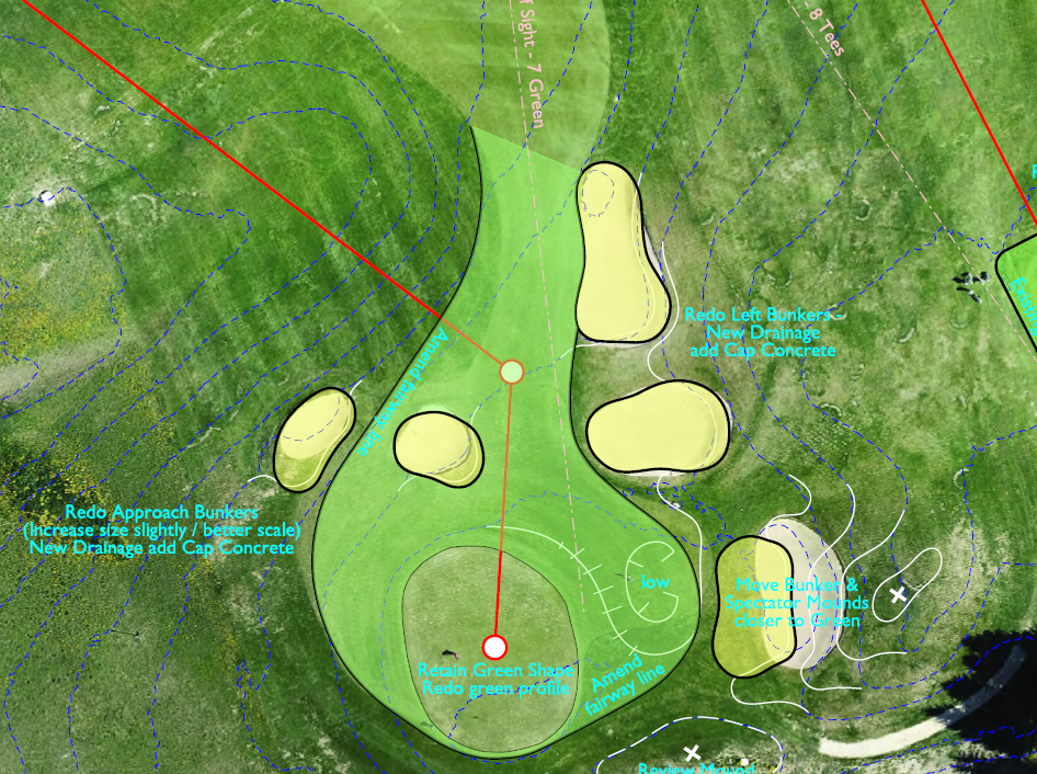 C’est pourquoi nous tenons à vous rassurer : aucun changement majeur ne sera apporté au tracé. La distance et la position du green resteront strictement identiques, et les trois plateaux du green seront conservés, simplement modernisés. Comme vous le verrez sur le plan ci-dessous, les changements prévus sont minimes et visent avant tout à préserver le caractère actuel du trou.