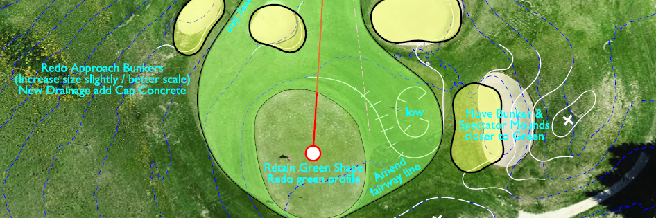 C’est pourquoi nous tenons à vous rassurer : aucun changement majeur ne sera apporté au tracé. La distance et la position du green resteront strictement identiques, et les trois plateaux du green seront conservés, simplement modernisés. Comme vous le verrez sur le plan ci-dessous, les changements prévus sont minimes et visent avant tout à préserver le caractère actuel du trou.