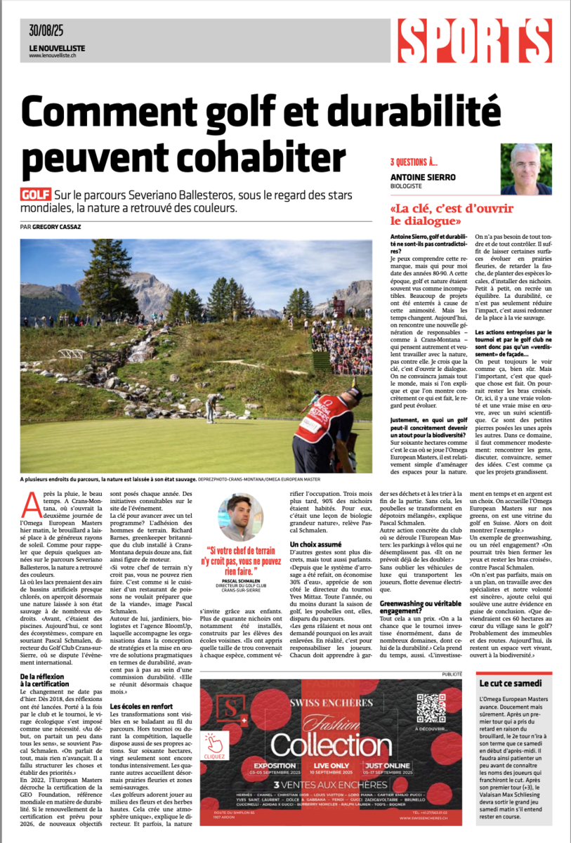 Découvrez l’avis du Directeur du Golf Club de Crans-sur-Sierre, Pascal Schmalen, et du biologiste Antoine Sierro dans cet article de presse paru dans le Nouvelliste du 30 août 2025.