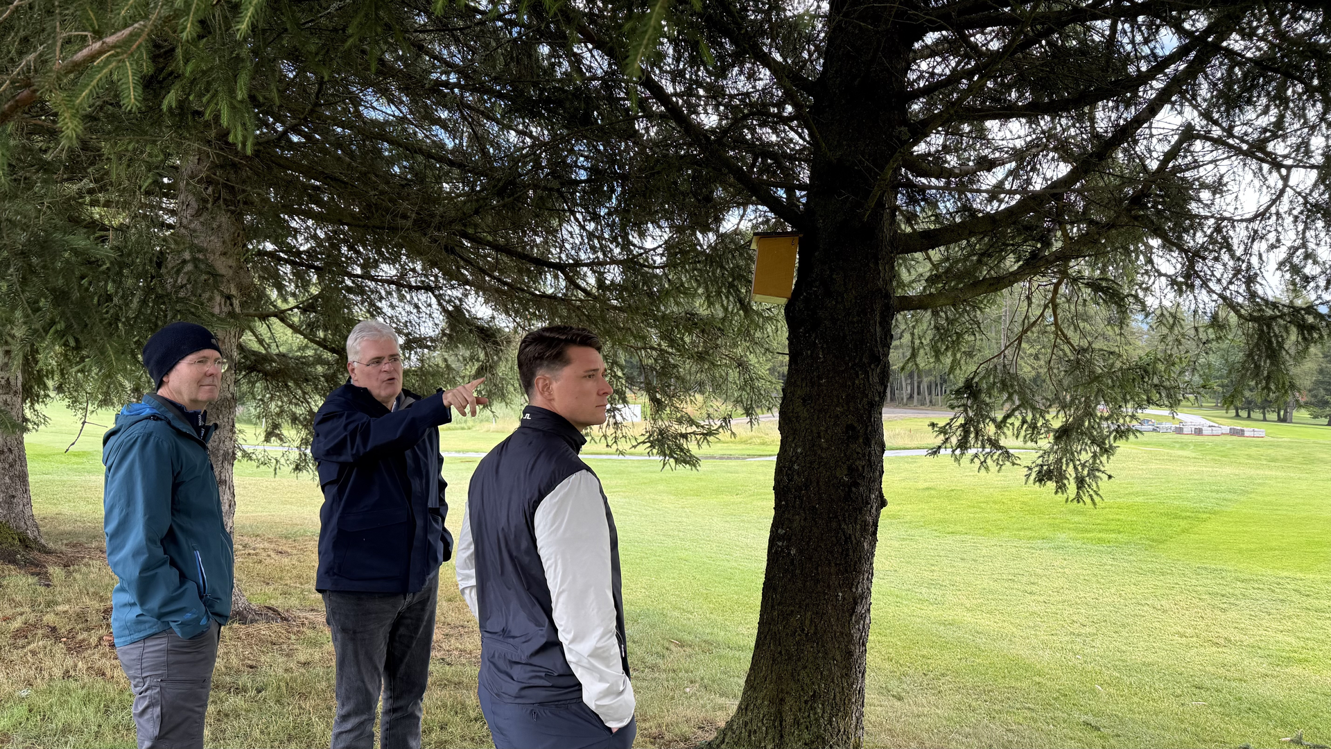 Antoine Sierro, biologiste, et Johnattan Ianchello, Golf Club Crans-sur-Sierre, présentent à l’auditeur David Bily notre action de pose de nichoirs le long du parcours.