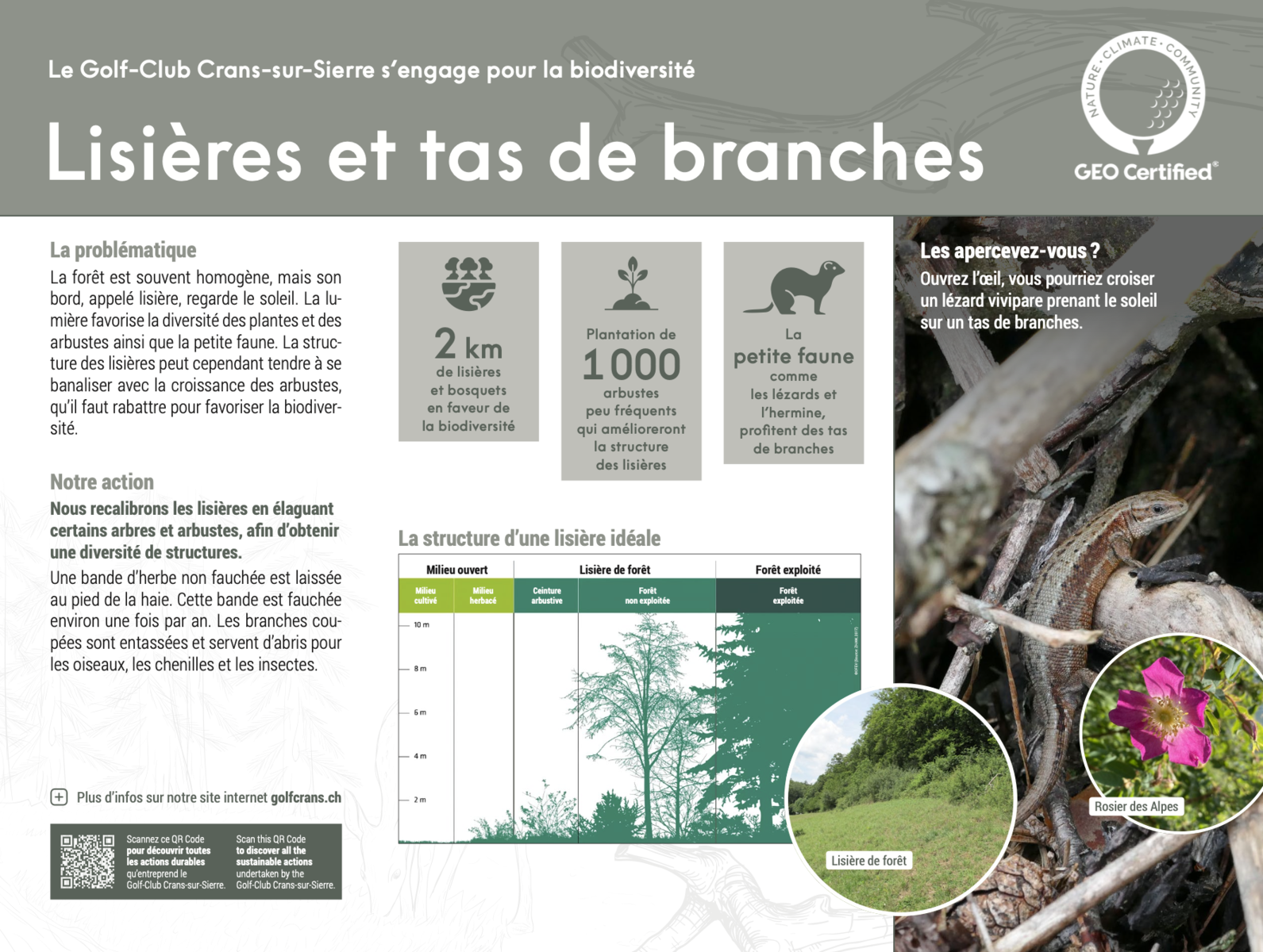 Les lisières offrent à nouveau un habitat diversifié, riche et varié où la pratique du golf fait bon ménage avec la biodiversité. Vous aussi, faites votre part en laissant un tas de branches et de feuilles mortes contre la haie au fond de votre propriété. Un hérisson y élira peut-être domicile. Un tas de pierre sera vite colonisé par les lézards et servira de lieu d’hivernage pour des larves et des chrysalides de papillons et de coléoptères. Évitez aussi de tailler toutes les branches des arbustes au cordeau et les oiseaux seront de retour.