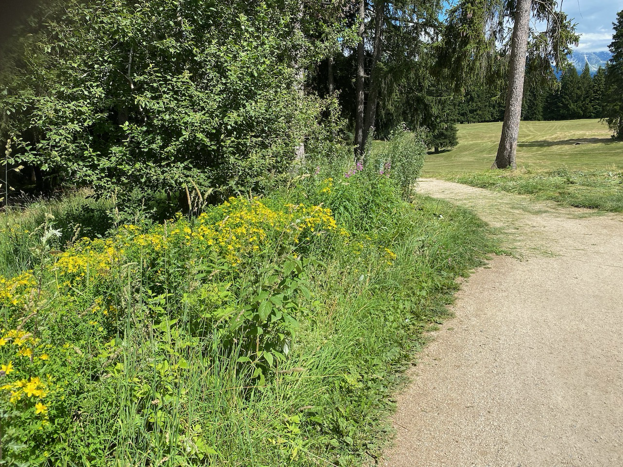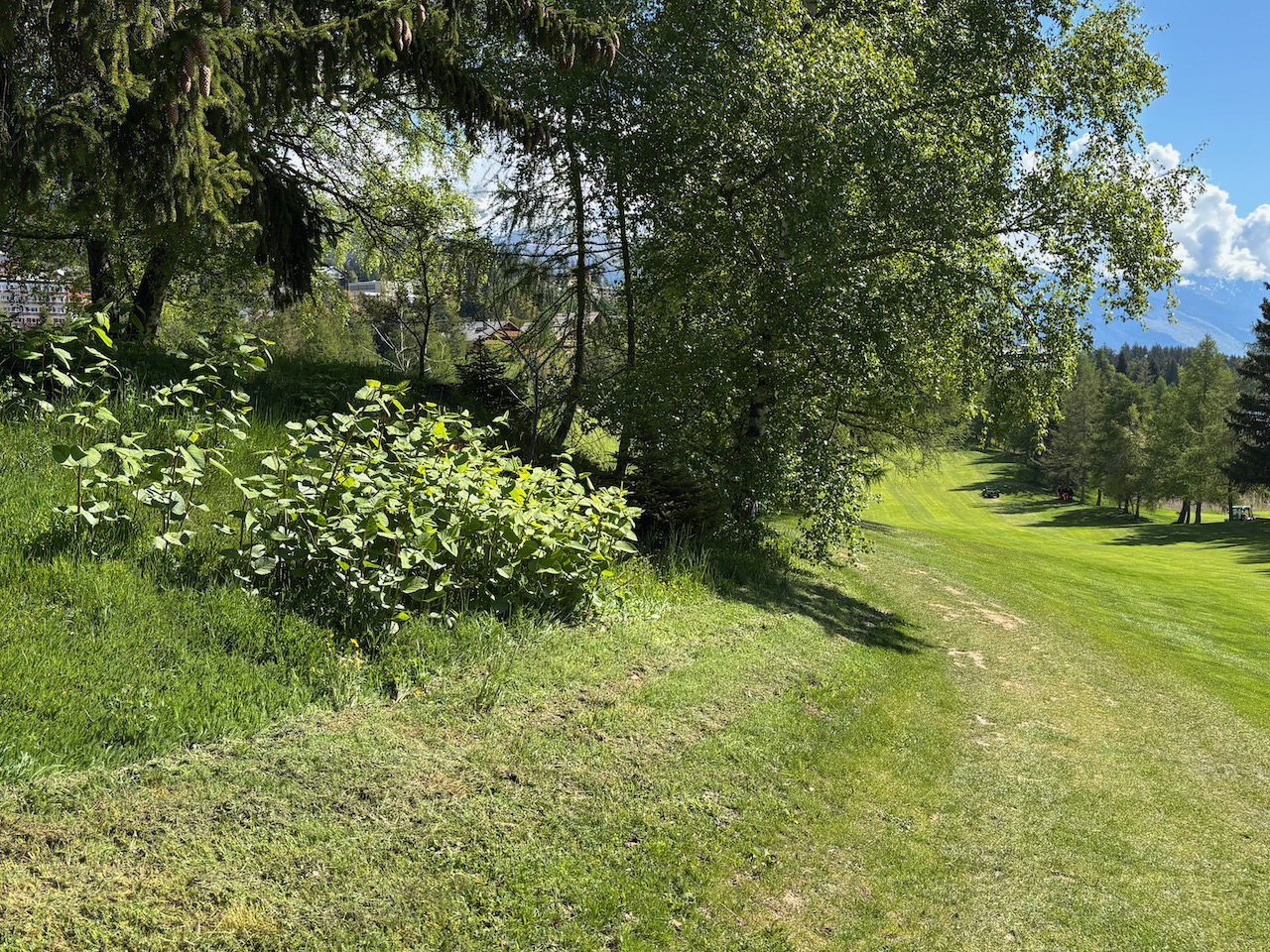 C’est dans cet esprit que travaille l’équipe d’entretien du golf. La fauche n’a plus lieu jusqu’au bord en été et la fauche totale est retardée en automne. Les grands arbres sont laissés à leur bon vouloir (Ph. 3a, 3b, 3c). Des tas de branches et des tas de pierres sont mis en place comme refuges pour la petite faune et l’épareuse n’est plus utilisée.