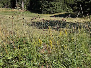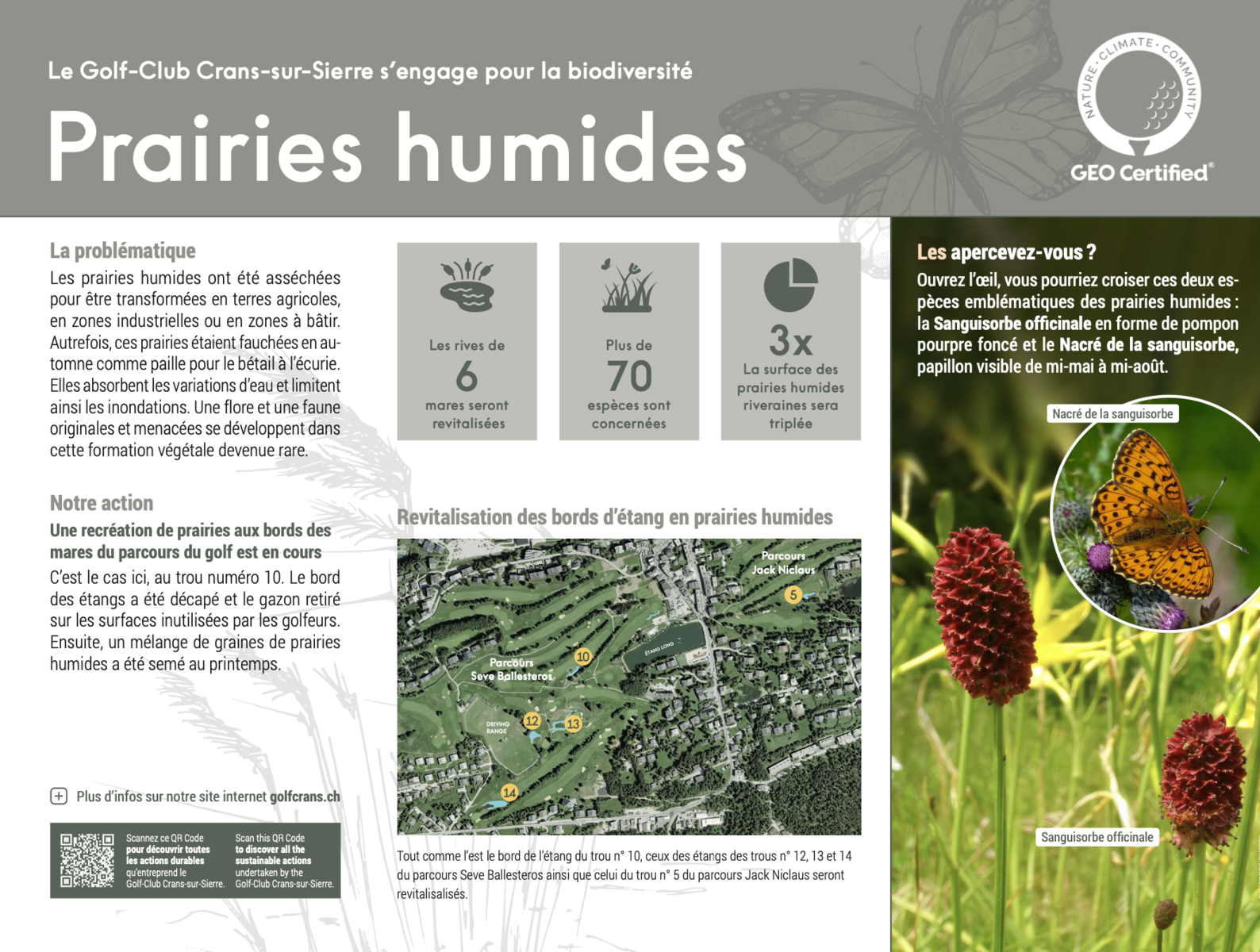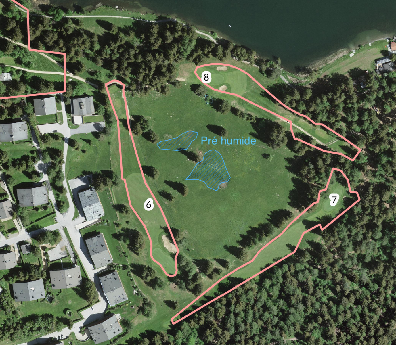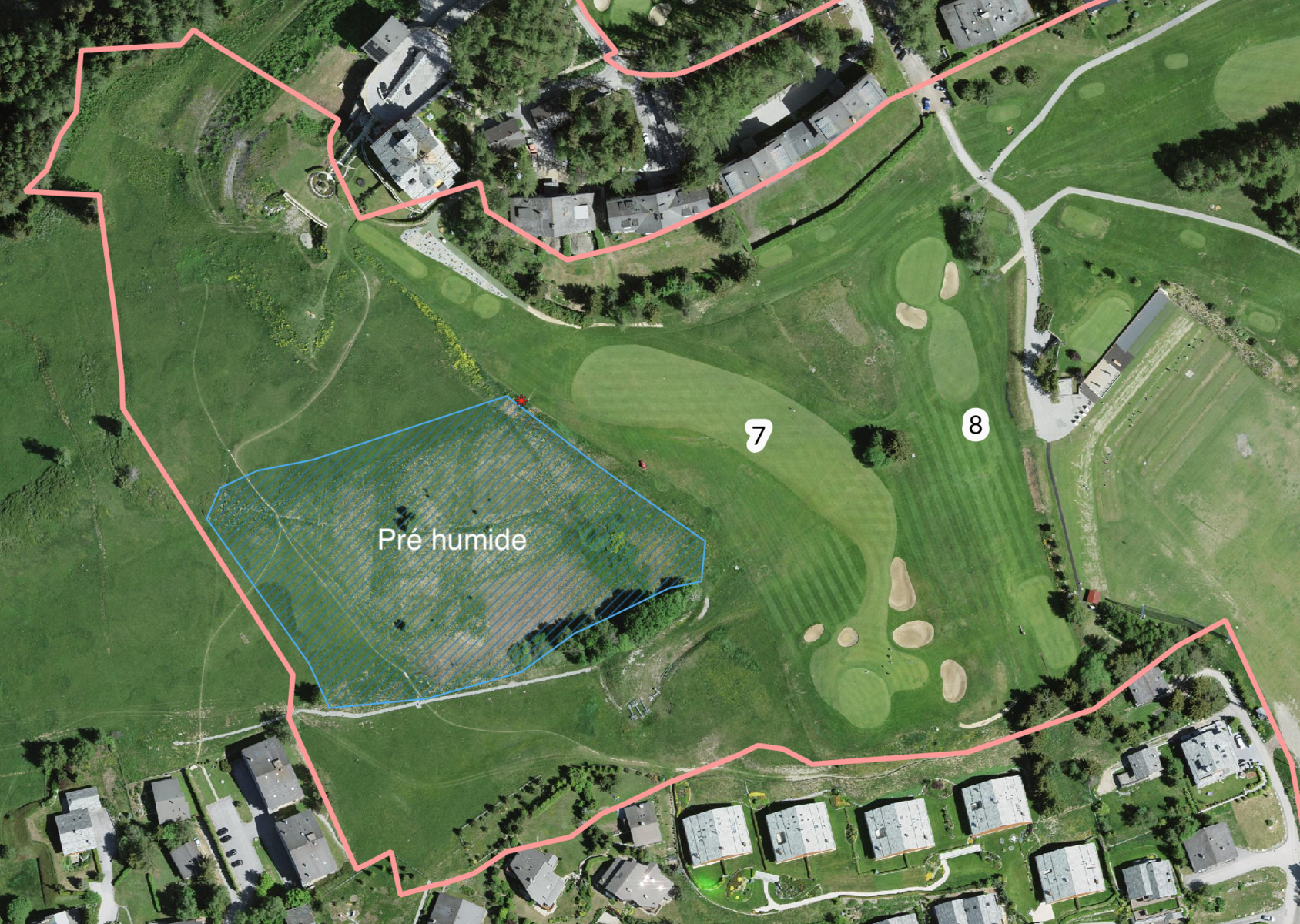 Le golf club de Crans-sur-Sierre met tout en œuvre pour restaurer ou conserver quelques beaux vestiges de ces prairies humides, par exemple à l’ouest du trou no 7 (S. Ballesteros, ph. 1a) et dans les cuvettes entre les tous 6, 7 et 8 du J. Nicklaus (ph. 1b). Elles sont fauchées annuellement par un tracteur là où c’est carrossable ; une partie reste non fauchée, ce qui favorise l’installation de buissons et de la forêt. Sans entretien par la fauche ou la pâture par le bétail, la prairie humide disparaît.